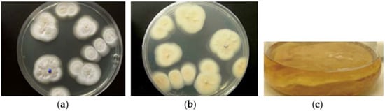 MF458; agar colony on WSP30 medium after 21 days of incubation at 22 °C. (a) Image taken from above the plate; (b) Image taken from below the plate; (c) a liquid culture (non-shaken) resulted in white mycelium growing mainly subsurface.