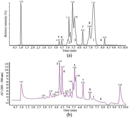 A more polar band of activity eluting from 5.0 to 5.5 min (Figure 2a) was also associated with components of relatively high molecular weights. Again, these compounds had no significant UV absorbance and molecular ions were detected in ESI+-MS at m/z 1607, 1621, 1635, 1649 and 1663, which are consistent with the presence of the known Tolypocladium spp. metabolites efrapeptins, being positively charged linear peptides [].