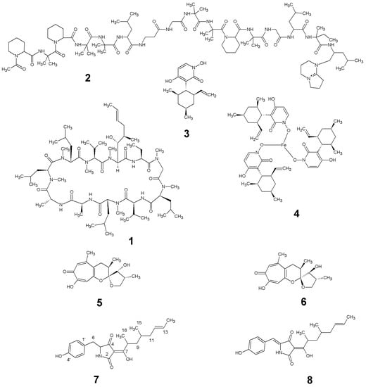 Natural products produced by Tolypocladium geodes sp. MF458: cyclosporin A (1); efrapeptin D (2); pyridoxatin (3); terricolin (4); malletenin B (5); malletenin E (6); tolypocladenol C (7); tolypocladenols A1 and A2 (8).