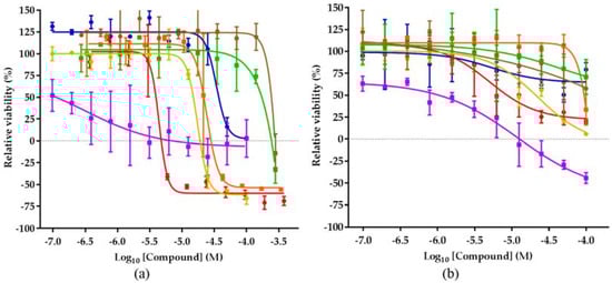 Activity of the isolated compounds in different cell lines. (a) Viability of MCF-7 cell line after 48 h compound treatment. (b) Viability of OVCAR-5 cell line after 48 h compound treatment; cyclosporin A (blue), efrapeptin (violet), malettinin B (orange), pyridoxatin (red), malettinin E (dark yellow), tolypocladenol C (green), tolypocladenol A1/A2 (brown).