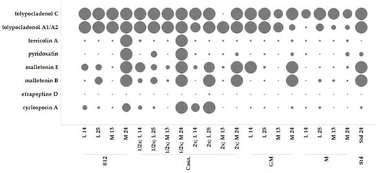 Comparison of production of MF458 natural product profiles in different media in Erlenmeyer (EM) flasks. Peak area (ion count) is given as size and ranges from 0 to 10 M; values above 10 M are shown as maximum; B12: Casamino acid supplemented with B12, Casa: casamino acid medium, half concentrated (½), double concentrated (2×), GM: casamino acid medium containing glucose and malt, M: casamino acid medium supplemented with molasses, L, liquid shaken culture, M. mycelium from standing culture, numbers indicate days of cultivation.