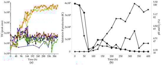 Optimisation of malettinin production. (a) Production of secondary metabolites in casamino acid medium supplemented with crystalline cellulose under STR conditions as peak area [total ion count (TIC)]; The color coding is: cyclosporin A (1, blue), efrapeptin (2, violet), malettinin B (5, orange), pyridoxatin (3, red), malettinin E (6, dark yellow), tolypocladenol C (7, green), tolypocladenol A1/A2 (8, brown). (b) Production of malettinin B (5): amount of malettinin B production (star); pH (ranging from 5.50 to 4.18, shown as point); O2 saturation in % (diamond).