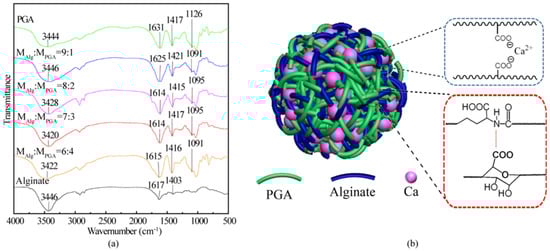 The absorption peak at 1126 cm−1 in the spectrum of PGA was assigned to the C–N stretching vibration of the secondary amine. The corresponding peak of the composite microparticles was shifted dramatically to 1095 cm−1 due to a strong electrostatic interaction between the amide group of PGA and the carboxylate group of alginate. In full, a double network structure (Figure 1b) was formed in the Alg/PGA microparticles via two kinds of interaction: the ion chelation between Ca2+ and carboxylate groups of PGA and Alginate and the electrostatic interaction between the secondary amine group of PGA and carboxylate groups of alginate and PGA.