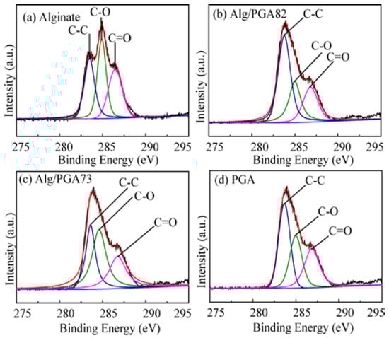 XPS C1s spectra of alginate (a), Alg/PGA82 (composite microparticles whose mass ratio is mAlg:mPGA = 8:2) (b), Alg/PGA73 (composite microparticles whose mass ratio is mAlg:mPGA = 7:3) (c) and PGA (d).