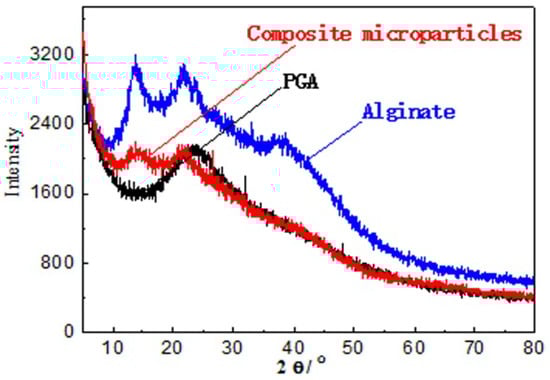 Figure 3 shows the X-ray diffraction (XRD) patterns of Alg, PGA and Alg/PGA microparticles. Alg exhibited two typical crystalline diffraction peaks at 13.73° and 21.71°. One crystalline diffraction peak was found at 21.43° in the XRD spectrum of PGA [,]. The Alg/PGA composite microparticles exhibited two broad diffuse diffraction peaks centered at 14.10° and 26.61°, indicating its poor crystallinity after the gelation. This can be explained by the fact that the original polymer crystal structures of Alg and PGA were destructed during the formation of the full-interpenetrating composite polymer, resulting in decreased lattice density. Meanwhile, the aggregation degree of the microparticles was increased due to the chelation between the COO− and Ca2+ and electrostatic interaction between polyelectrolytes. Therefore, the crystalline diffraction peaks of the composite were diffused and a network structure was established in the composite microparticles.
