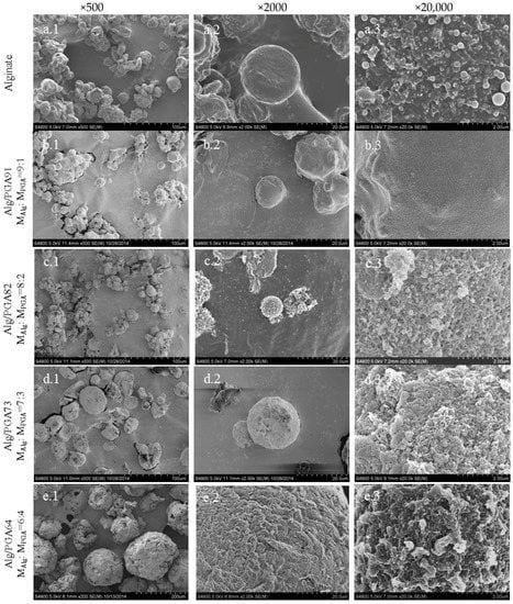 Higher feeding ratio of PGA leads to bigger composite microparticles and more irregular particle surface. Clusters on the surface of microparticles prepared with mAlg:mPGA = 6:4 were also detected. When compared with other types of microparticles, the PGA microparticles contain rare and larger pores.