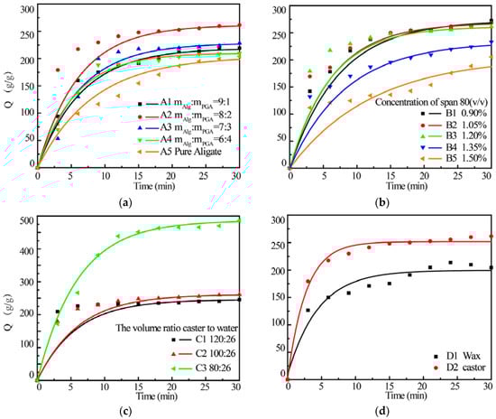The effects of the oil to water ratio in the reaction medium on the swelling behavior were further studied. The results indicate sample C5 prepared in a medium with Vcastor:Vwater = 80:26 showed the fastest absorption rate and highest water absorption ratio at the same time (Figure 5c and Table 2). The oil content can also significantly affect the droplet size of the composite. Higher oil phase content leads to a reduction in specific surface area and an increased droplet size, resulting in undesired swelling behavior [].