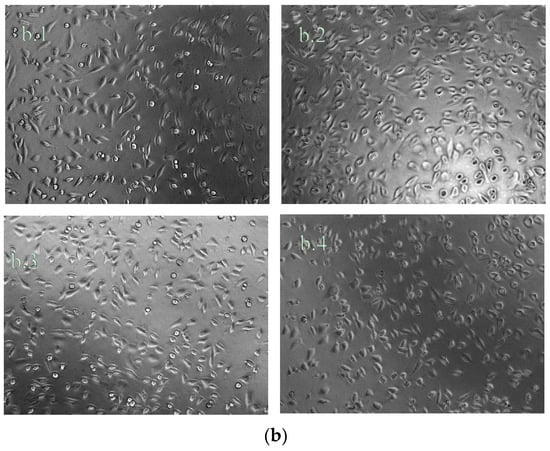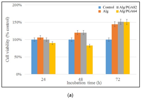 Cytotoxicity is one of the most important methods for biological safety evaluation []. The cytotoxicity of Alg/PGA composite microparticles was evaluated with cellular morphology and relative cell viability (RCV). As shown in Figure 6, the cytotoxicity of the leach liquors of the composite microparticles are 0 grade or 1 grade according to the RCV after 24, 48 and 72 h cultures, which means that the cytotoxicity evaluation is valid. There was no significant difference between experimental groups and control group after 24 and 48 h cultures (p > 0.05). After the 72 h culture, obvious enhanced cell viability of all three experimental groups was observed compared with control group according to the CCK-8 assay. As shown in Figure 6b, no pronounced cell debris or changes in morphology, such as cell lysis, loss of spindle shape or detachment from the bottom, were observed in the samples. The above results confirm good cytocompatibility of the leach liquors of the composite microparticles.