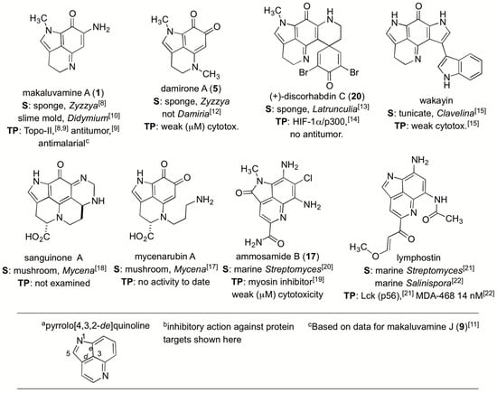 A summary of similar natural products containing the C10N2 pyrrolo[4,3,2-de]quinoline core along with their sources (S) and therapeutic potential (TP).
