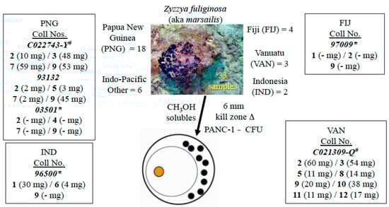 Specimens of Z. fuliginosa were collected from Papua New Guinea (PNG) (collection number 93132, 1.8 kg wet weight and 03501, 1.2 kg wet weight), Indonesia (96500; 1.2 kg wet weight), and Fiji (97009; 1.9 kg wet weight) using SCUBA at depths between 15 and 30 m by members of the UCSC team, a representative underwater photograph of this organism is shown in Figure 2. Two Z. fuliginosa extracts, obtained from the NCI-DTP repository were collected from PNG (C022743-Y) and Vanuatu (C021309-Q).