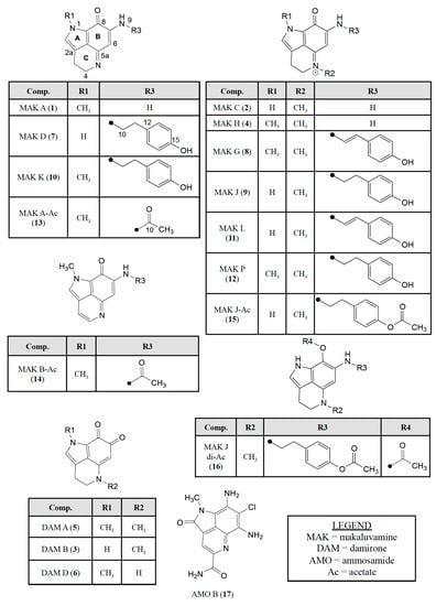 - Schmidt, E.W.; Harper, M.K.; Faulkner, D.J. Makaluvamines H-M and Damirone C from the Pohnpeian sponge Zyzzya fuliginosa. J. Nat. Prod. 1995, 58, 1861–1867. [Google Scholar] [CrossRef] [PubMed]