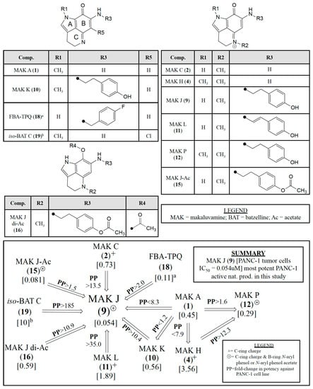 The boxed panel in Figure 4 highlights that makaluvamine J (9) with code “⊕” indicating a C-ring charge and a B-ring 4-ethyl phenol substituent is the most potent against PANC-1, exhibiting an IC50 of 0.054 μM. The designed synthetic compound, FBA-TPQ (18) [25], does not contain a positive charge on the C-ring but does contain a 4-fluorobenzyl substituent on the B-ring, is ~50% less potent than 9 with an IC50 of 0.11 μM. 15-O-acetyl makaluvamine J (15) which only differs from 9 by the addition of an acetyl group on the R3 substituent is only slightly less potent (PP < 1.5) than 9 with an IC50 of 0.081 μM. However, the diacetyl makaluvamine J (16) which differs from 9 in having an aromatized B-ring and substituents at position R3 and R4, is ~10-fold less potent than 9 as it has different ABC-ring conjugation and no positive charge on the C-ring. Additionally, when comparing 9 and makaluvamine K (10) which only differ in their N-methyl position (9 R1 = H, R2 = CH3; 10 R1 = CH3, R2 = none [no + charge on C-ring]) there is a 10.4-fold decrease in potency, further indicating that the presence of the positive charge on the C-ring is important for potency.