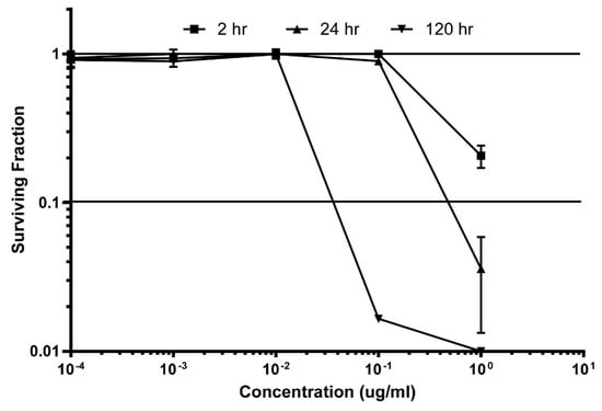 Preclinical evaluation of makaluvamine J (9) through clonogenic dose-response evaluation employing HCT-116 cells. Continuous exposure of the cells with 9 at different concentrations during periods of: 2 h, 24 h, or 120 h. Efficacy is indicated when the surviving fraction is less than 0.1.