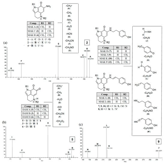 Makaluvamine and damirone MS2 fragmentation ions diagnostic for N-alkyl substitutions for the pyrolo[4,3,2-de]quinoline core family. Annotated peaks, especially intense m/z ions in bold, represent a signature fingerprint. The panels (a, c) illustrate fragmentations for the iminocyclohexadienones (examples MAK C (2) and MAK J (9)) and panel (b) shows fragmentation for the animocyclohexadienediones (example DAM A (5)).