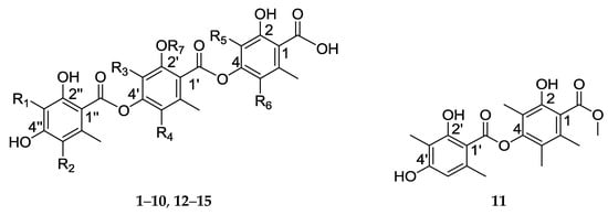 Compounds 12–15 were identified as thielavin A (12), thielavin H (13), thielavin J (14), and thielavin K (15), by comparison of their spectral data with those reported in the literature [,].