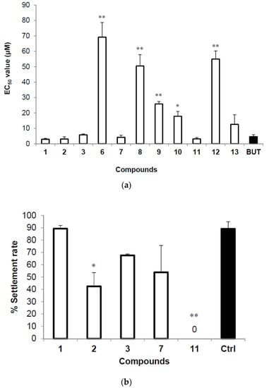 Anti-larval settlement activity of compounds from the fungus Thielavia sp. UST030930-004 against Balanus amphitrite. EC50 means the settlement of 50% of the larval population was inhibited, compared with the negative control. Data presented are the mean ± SE of three independent experiments performed in triplicate. Butenolide was served as the positive control.