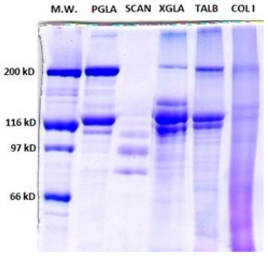 Figure 1 shows the PSC electrophoretic patterns of the analysed species. The PSC SDS-PAGE pattern from PGLA and TALB were more similar to the type I collagen pattern where two identical α1-chains (120 kDa), one α2-chain (110 kDa), and one β dimer band of about 200 kDa can be observed [,]. The molecular weight data obtained for α and β chains of PSC from TALB are similar to those previously published for the same species [,]. The cross-linking rate of collagen has been reported to be low; which might explain why highly cross-linked components (γ-component) in PGLA, TALB, and XGLA are shown only as a faint bands in Figure 1 [,]. This result indicates that pepsin was able to hydrolyse the cross-links in the telopeptide region without damaging the integrity of the triple-helix.