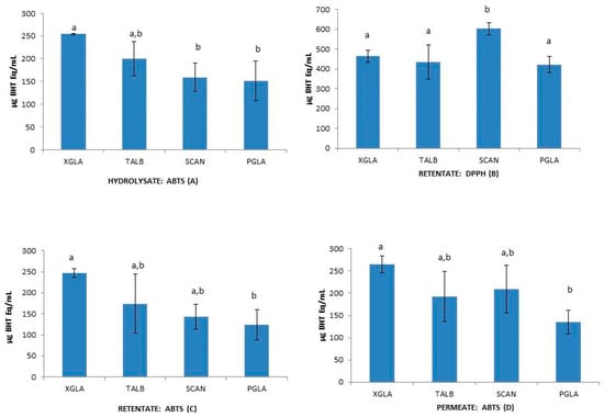 Interspecies differences in hydrolysate fraction using ABTS (A); in retentate fraction using DPPH (B) and ABTS (C); in permeate fraction using ABTS (D). Different letters indicate significant differences among means (p ≤ 0.05).