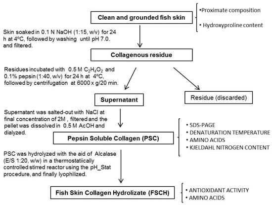 Collagen from skin was extracted according to the methodology of Liu et al. [] with minor modifications (Figure 4). All procedures were performed at 4 °C. Skin pieces of blue shark and small-spotted-catshark were first treated with 0.1 N NaOH (1:15, w/v) and stirred for 24 h. Then, skins were washed with cold distilled water until a neutral pH was found, and skin residues were extracted with 0.5 M acetic acid containing 0.1% (w/v) pepsin (0.5 U/mg; Acros Organics, Janssen Pharmaceuticalaan 3a, Geel, Belgium), at a sample solution ratio of 1:40 (w/v) for 24 h. Suspension was centrifuged at 6000× g for 20 min, the residue discarded and the supernatant was salted-out by adding NaCl (final concentration of 2 M). The precipitate was dissolved in 0.5 M acetic acid and dialyzed against water using 12,000 Da cut-off membranes for 3 days. Aliquots were obtained and freeze-dried for analysis of Kjeldahl nitrogen, amino acid content, denaturation temperature, and electrophoresis. The remaining liquid volume of dialyzed PSC was stored frozen at −20 °C until used for hydrolysis.