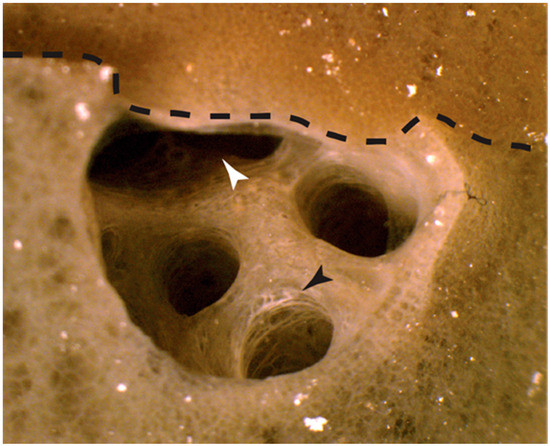 Remodelling of an osculum following self-grafting. An internal osculum bisected during graft preparation and placed at the autograft interface triggered the adjacent self-sponge piece to remodel to form a continuous chamber inside the fused sponge by 72 h post grafting (hpg). Black arrow—white cellular region can be seen at the cut surface of the osculum that was not in contact with self and signs of sponge healing are apparent by 72 hpg. White arrow—indicates where the chamber continued into the other half of the sponge autograft. Visual inspection of the chamber revealed that it continued deep inside the sponge.