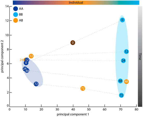 Principal component analysis of dynamically expressed genes. Each circle represents a transcriptome within the graft time courses. Dots are coloured by donor sponge (A/AA—dark blue, B/BB—light blue, AB—orange; Donor AB is coloured grey to indicate that it is an artificial sample formed by merging the Donor A and Donor B sequencing reads) and numbered by time point (0–donor sample, 12–12 h post grafting (hpg), 24–24 hpg, 48–48 hpg, 72–72 hpg). Shaded rings group the A/AA and B/BB samples, respectively. Dashed lines link samples representing the same time point from different time courses. Shaded bars at the top and right sides of the graph summarise the results of the analysis, showing the biological variables that best explain the sample separations observed across each axis. Sample separation is based on the top 0.9th quantile of dynamically expressed genes, as determined by BLIND (“Basic Linear INdex Determination of transcriptomes”; see Materials and Methods).