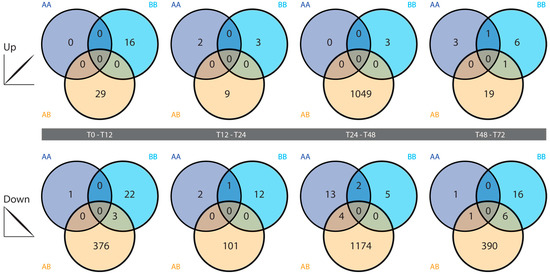 Differentially expressed gene counts. Each Venn diagram shows the number of differentially expressed genes that are up- (top) or down-regulated (bottom) with an observed fold change of 4-fold or greater between pairs of successive time points, in the AA (dark blue), BB (light blue) and/or AB (orange) time courses.
