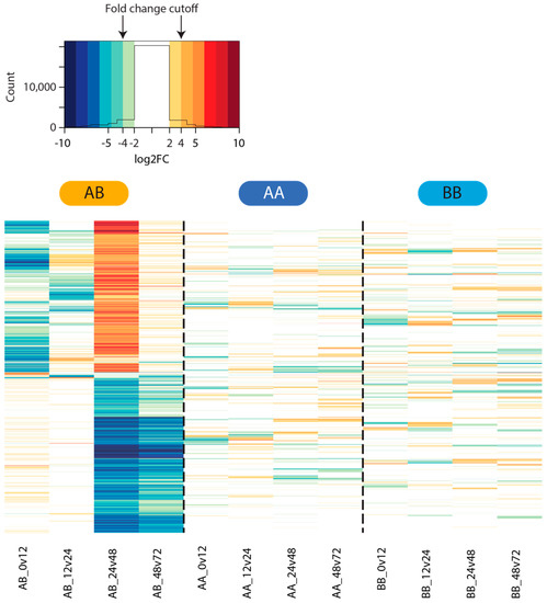 Independent filtering was performed to remove statistically uninformative genes and improve multiple testing correction outcomes [48], using the Bioconductor packages genefilter v1.46.1 [49] and DESeq v1.16.0 [50] as described in the genefilter vignette [49]. The bottom 50% of genes, as ranked by total genewise counts across samples, were removed accordingly. Differential gene expression (DGE) analysis was performed using EdgeR version 3.6.8 [51,52,53,54]. To help compensate for the lack of available replication, a reduced experimental model was generated in which the within-time course samples were grouped together, and the common dispersion across all genes was calculated using this model (common dispersion = 0.1606744). The analysis was then re-run with the full explanatory model, where samples were grouped by treatment (AA, BB or AB) and time (0 hpg to 72 hpg). The common dispersion value determined above was also used for this analysis. Genes exhibiting statistically significant (p ≤ 0.01) changes of four-fold or greater (log2) expression were identified using EdgeR’s GLM functionality.