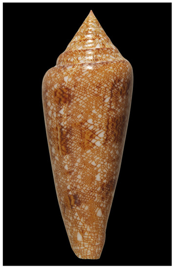 - Röckel, D.; Korn, W.; Kohn, A.J. Manual of the Living Conidae; Verlag Christa Hemmen: Wiesbaden, Germany, 1995. [Google Scholar]
