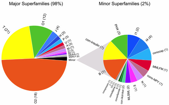 The two species also share a similar total number of conotoxin transcripts. A total of 97 conotoxin transcripts (from the 23 conotoxin superfamilies reported in both species) were identified here in C. gloriamaris, compared with 119 reported in C. victoriae [13,40,47]. It should be noted that the venom glands of multiple individuals of C. victoriae were used, while in this study, the venom gland of a single individual of C. gloriamaris was used. Thus, the population level genetic polymorphism, as reported in other Conus species [57], potentially contributes to the slightly greater total number of transcripts reported for C. victoriae.