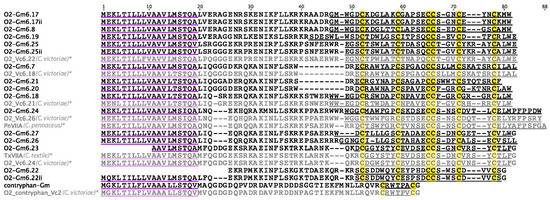 Sequence alignment of C. gloriamaris O2-superfamily precursor sequences. Precursor sequences of O2_Vc6.22, O2_Vc6.18, O2_Vc6.21, O2_Vc6.26, O2_Vc6.24, O2_contryphan_Vc2 [13], PnVIIA [20], and TxVIIA [19] are shown for comparison in grey and marked with *; Cys, yellow; Signal peptides are underlined in purple and predicted mature peptides are underlined in black/grey. This color scheme is used in all subsequent figures.