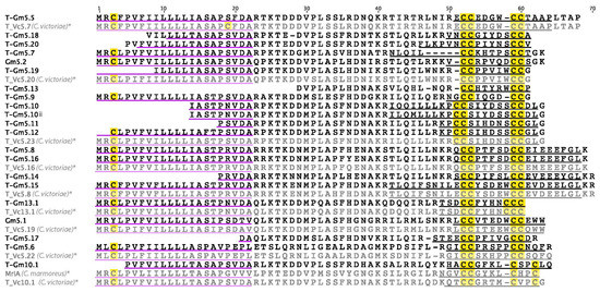 In C. gloriamaris, the T-superfamily is the second most highly expressed toxin gene family, making up 22% of the total conotoxin expression. It is also the most diverse: 21 individual sequences were identified (Figure 4), including the previously reported Gm5.1 and Gm5.2 [21]. Nineteen of these had a type V cysteine framework (CC-CC), one a type XIII framework, and one a type I/X cysteine framework (CC-C-C). Several molecular targets, including presynaptic calcium channels [22], TTX-sensitive sodium channels [23], and somatostatin receptors [24], have been reported for conotoxins of the former subclass, while the toxins of the latter subclass are norepinephrine transporter inhibitors [25]. For several of the C. gloriamaris T-superfamily conotoxins identified here, an identical or nearly identical sequence was previously described in C. victoriae.