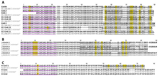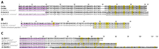 (A) C. gloriamaris O1-superfamily; (B) J-superfamily; (C) H-superfamily precursor sequences. *, precursor sequences of O1_Vc6.36, O1_Vc6.41, O1_Vc6.35, O1_Vc6.30, O1_Vc6.28, O1_Vc6.37, J_Vc14.1, J_Vc14.2, J_Vc14.4, H_Vc7.2, and H_Vc1 [13] are shown for comparison.