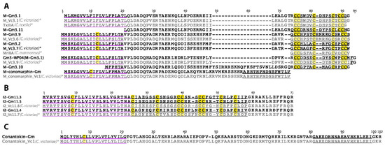 (A) C. gloriamaris M-superfamily; (B) I2-superfamily; (C) B-superfamily precursor sequences. *, precursor sequences of M_Vc3.1, M_Vc3.6, M_Vc3.9, M_conomarphin_Vc1, I2_Vc11.8, I2_Vc11.7, conantokin_Vc1 [13], TxIIIA [34], and the mature peptide of MrIIIA [35] are shown for comparison.