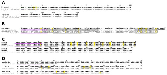 (A) C. gloriamaris B2-superfamil; (B) Con-insulin; (C) prohormone-4; (D) conoCAP precursor sequences. *, precursor sequences of B2_Vc1 [13], Con-Ins Tx1 [39], Con-Ins Vc1, PH4-Vc1 [40], and conoCAP [41] are shown for comparison.