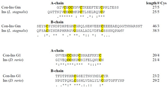 Similarity in cysteine arrangement, chain lengths, and amino acids between the A and B chains of Con-Ins Gm and an endogenous molluscan insulin, and Con-Ins G1 and an endogenous fish insulin. Comparative alignments of Con-Ins Gm and the giant pond snail Lymnaea stagnalis insulin 1 [Uniprot: P07223], and Con-Ins G1 from the venom of C. geographus and the zebrafish Danio rerio insulin [Uniprot: O73727]. Chain lengths and the cysteine number are shown following the sequence. Cysteines are highlighted in yellow. Post-translational modifications are omitted.