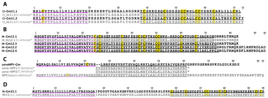(A) C. gloriamaris I1-superfamily; (B) I4-superfamily; (C) cono-NPY; (D) N-superfamily precursor sequences. *, precursor sequences of I1_Vc11.5, I1_Vc11.1, I4_Vc12.1 [13], cono-NPY [45], and Mr15.1 [10] are shown for comparison.