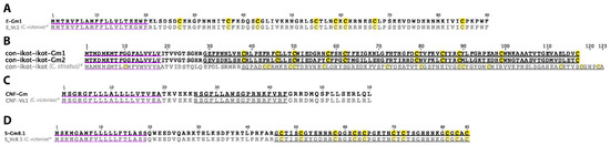 (A) C. gloriamaris E-superfamily; (B) con-ikot-ikot; (C) conorfamide; (D) S-superfamily precursor sequences. *, precursor sequences of E_Vc1, S_Vc8.1 [13], con-ikot-ikot [46], and CNF_Vc1 [47] are shown for comparison.