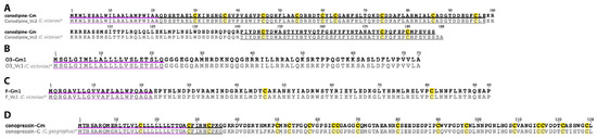 A single F-superfamily sequence was identified in C. gloriamaris (Figure 12C). Similar to the E-superfamily, this “superfamily” is defined by one precursor sequence, each from C. marmoreus [10] and C. victoriae [13], and no biological function has been reported. The alignment of the C. gloriamaris sequence with that of C. victoriae reveals complete identity across the entire peptide precursor.