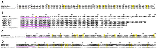 (A) C. gloriamaris MKAVA-superfamily; (B) MSRLF-superfamily; (C) MMLFM-superfamily; (D) MLSML-superfamily precursor sequences. *, precursor sequences of G114, G118, G120 [52], C. caracteristicus ‘putative conotoxin’ (GenBank: B0L0Y6.1), and Cln_SF6_1 [54] are shown for comparison.