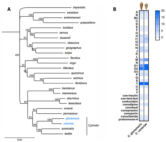 Conus gloriamaris shares a near-identical toxin gene family repertoire to the closely-related species Conus victoriae. (A) Phylogenetic tree of various Conus species highlighting close relatedness of C. gloriamaris and C. victoriae (subgenus Cylinder). Neighbor-joining tree of concatenated 12S, 16S and COI sequences was generated (Jukes-Cantor model) using Geneious version 8.1.3. Sequences were obtained from GenBank. Conus imperialis was used as an outgroup. Branch labels show consensus support (%); (B) A comparison of the expressed toxin gene family repertoire of C. gloriamaris and C. victoriae. Heat map is indicative of individual conotoxin number in each gene family.