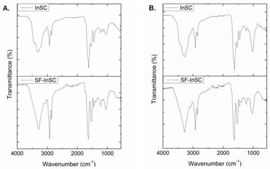 IR spectra of insoluble collagen before (InSC; upper) and after (SF-InSC; lower) spicule removal isolated from A. cannabina (A) and S. carnosus (B).