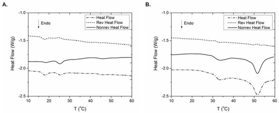 Temperature modulated DSC data of intercellular collagen (ICC) isolated from A. cannabina (A) and S. carnosus (B). The total (---), non-reversing (―) and reversing heat (-∙-) flows are presented (curves are shifted vertically for clarity).