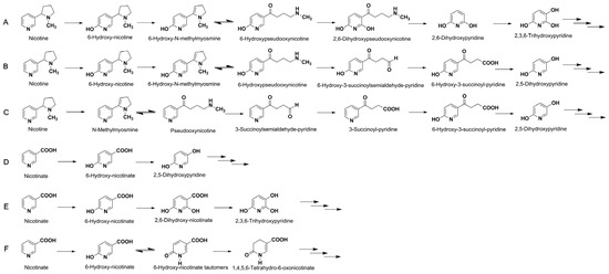 The overview of biodegradation pathways of (A–C) nicotine and (D–F) nicotinic acid (NA). (A) The pyrrolidine pathway; (B) the pyridine pathway; and (C) a variant of the pyridine and pyrrolidine pathways of nicotine degradation. (D) NA degradation pathways by Pseudomonas; (E) Bacillus; and (F) Eubacterium strains. The three consecutive arrows indicate the ring-cleaving which finally reaches the tricarboxylic acid cycle.
