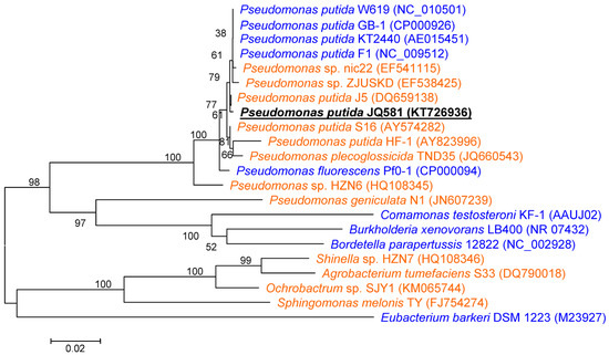 Phylogenetic analysis of strain JQ581 and related species by the neighbor-joining approach. The GenBank accession numbers are shown in parentheses. The scale bars represent 0.02 substitutions per site. The strains that could degrade nicotine are shown in orange: Pseudomonas putida S16 [7,20,21,22], Pseudomonas sp. nic22 [23], Pseudomonas sp. ZJUSKD [24], Pseudomonas putida J5 [25], Pseudomonas putida HF-1 [26], Pseudomonas plecoglossicida TND35 [27], Pseudomonas sp. HZN6 [28,29,30], Pseudomonas geniculata N1 [31], Shinella sp. HZN7 [16], Agrobacterium tumefaciens S33 [32], Ochrobactrum sp. SJY1 [33], Sphingomonas melonis TY [34]. The strains that could degrade NA are shown in blue: Pseudomonas putida KT2440, W619, GB-1, F1, and Pseudomonas fluorescens Pf0-1 [9], Comamonas testosteroni KF-1 [9], Burkholderia xenovorans LB400 [9], Bordetella parapertussis 12822 [9], and Eubacterium barkeri DSM 1223 [8].