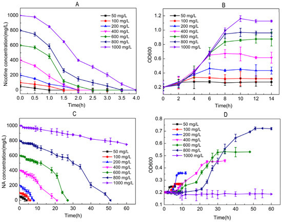 The degradation of nicotine/NA by strain JQ581 was performed in 250 mL Erlenmeyer flasks with 100 mL of sterile MSM. Inocula were prepared by inoculating the individual colony into 100 mL of LB at 30 °C with shaking at 180 rpm. The bacterial cells in the late-exponential growth phase were harvested by centrifugation at 6000× g for 5 min and washed with MSM and resuspended in MSM. Strain JQ581 was pre-cultured in MSM with 100 mg/L nicotine or NA for 12 h. Next, the strain was harvested and the OD600 was adjusted to 1.0. Five percent of this suspension was used as the inocula for subsequent studies. Different initial nicotine/NA concentrations were set as 50, 100, 200, 400, 600, 800, and 1000 mg L−1. The experiment was conducted in triplicate at 30 °C on a rotary shaker at 150 rpm. The non-inoculated samples served as controls. Samples were collected periodically from the cultures. Growth was monitored by measuring the optical density (OD) value at 600 nm, and the residual nicotine/NA concentration was measured by HPLC.