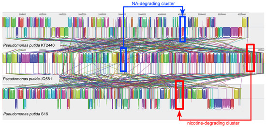 Alignment of the genomes from strain KT2440, JQ581, and S16 using the MAUVE software. Identically-colored boxes indicate homologous regions in the three sequences. The gene clusters for biodegradation of nicotine and NA are shown in red and blue, respectively.