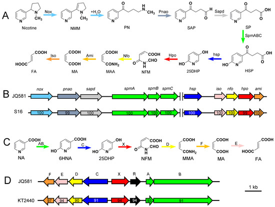 (A) Proposed nicotine degrading pathway by strain JQ581; (B) Genetic organization of the nicotine cluster in strains JQ581 and S16 [7]; (C) Proposed NA degrading pathway by strain JQ581; (D) Genetic organization of the NA cluster in strains JQ581 and KT2440 [9]; The arrows in (C) and (D) indicate the size and direction of each gene. NMM: N-Methylmyosmine; SAP: 3-Succinoylsemialdehyde-pyridine; FA: Fumaric acid; MA: Maleic acid; MAA: Maleamic acid; 25DHP: 2,5-Dihydroxypyridine. Numbers within the arrows indicate the DNA sequence identity with the orthologous gene from strain JQ581.
