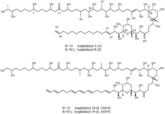 - Satake, M.; Murata, M.; Yasumoto, T.; Fujita, T.; Naoki, H. Amphidinol, a polyhydroxypolyene antifungal agent with an unprecedented structure, from a marine dinoflagellate, Amphidinium klebsii. J. Am. Chem. Soc. 1991, 113, 9859–9861. [Google Scholar] [CrossRef]