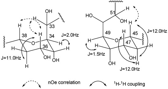 | 2 | CH | 73.1 | 3.71, m | 73.0 | 3.61, m | 34 | CH | 79.2 | 4.26, dd, 9.5, 2.0 | 79.1 | 3.99 d, m |