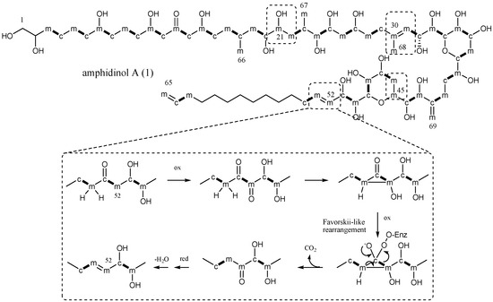 - Houdai, T.; Matsuoka, S.; Murata, M.; Satake, M.; Ota, S.; Oshima, Y.; Rhodes, L.L. Acetate labeling patterns of dinoflagellate polyketides, amphidinols 2, 3 and 4. Tetrahedron 2001, 57, 5551–5555. [Google Scholar] [CrossRef]